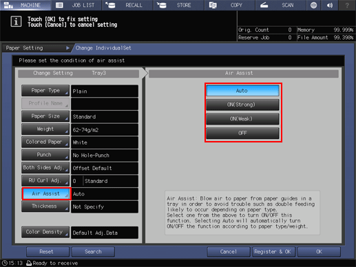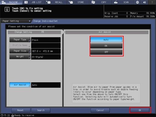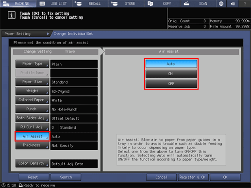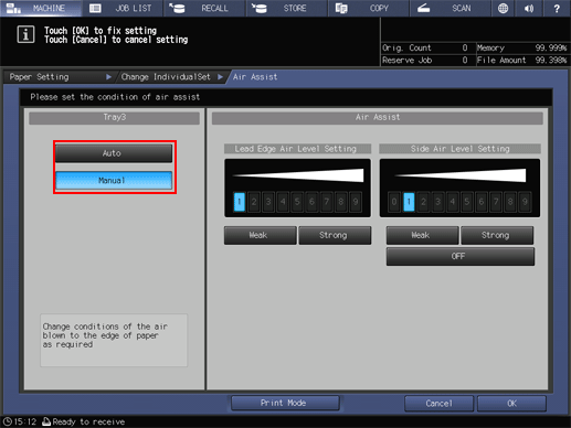 If you select Tray3 or Tray4 of Paper Feeder Unit PF-602m in step 5, the following Air Assist screen is displayed.
