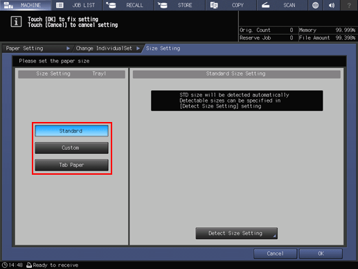 With Standard selected, the machine automatically detects the standard size when loaded with standard size paper in that tray.