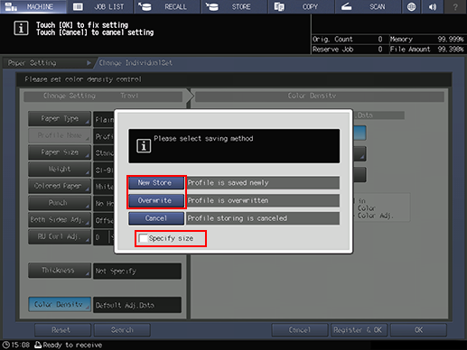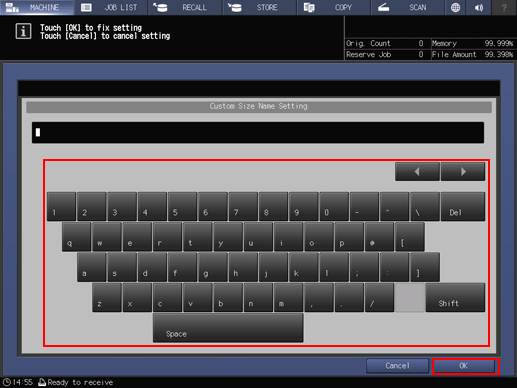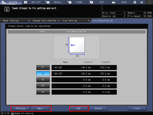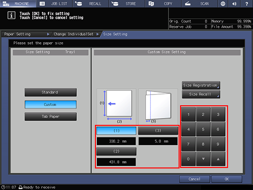 supplementary explanationAfter entering the value, press Size Registration. The Size Registration screen is displayed.