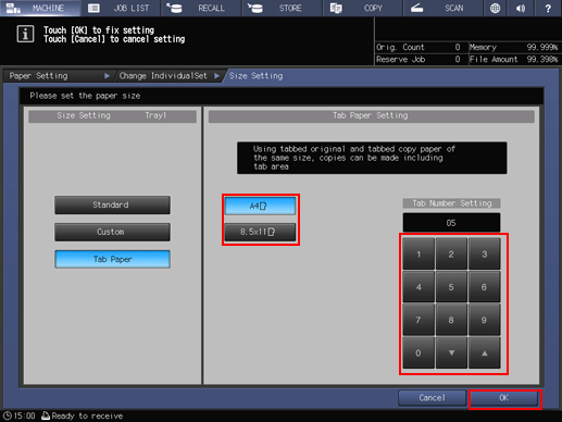 Use the touch panel keypad, down, up, or the keypad on the control panel to enter the number of tabs. Setting range for the number of tabs is from 1 to 15.