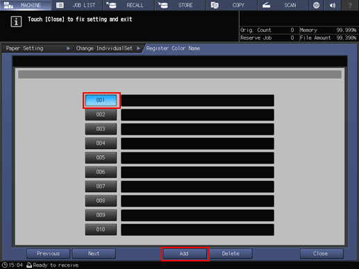 supplementary explanationPress the number key on the left side of the desired entry, then press Add. The Custom Size Name Setting screen is displayed.
