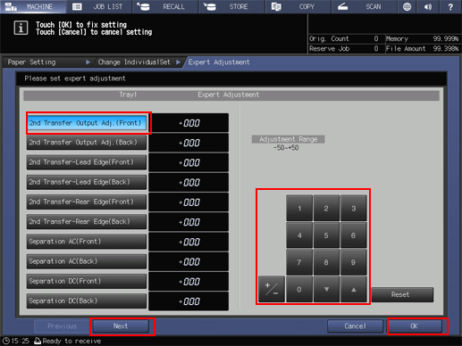 supplementary explanationFor items from 2nd Transfer Output Adj. (Front) to RU Speed Adjustment(Banner), select the desired adjustment item button, then use the keypad on the screen, press the down/up key, or press the keypad on the control panel to enter the numeric value.
