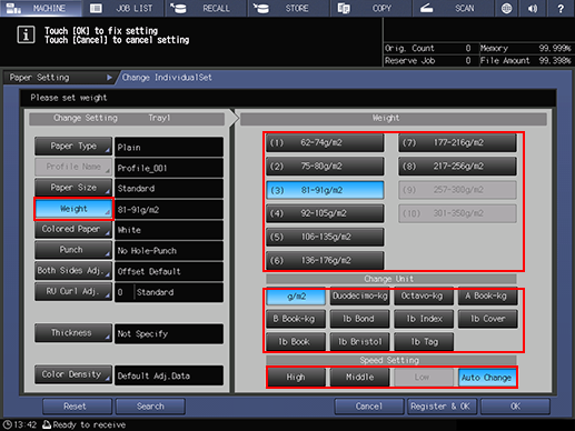 Process speed can be switched using the keys under Speed Setting. Some speed settings cannot be selected depending on the paper weight. Select the desired button. High is available when the weight is set to 216 g/m2 / 57 lb Bond or less, and Middle is available when the weight is set to 256 g/m2 / 68 lb Bond or less. Also, Low is available when the weight is set to 217 g/m2 / 58 lb Bond or more.
