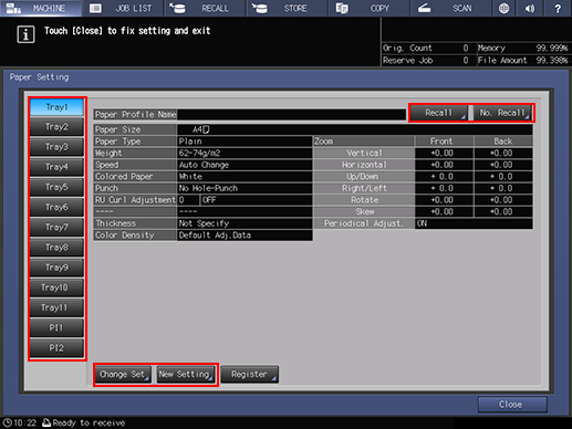 Pressing Recall displays the Recall screen, on which registered paper specifications can be selected. Proceed to step 7.