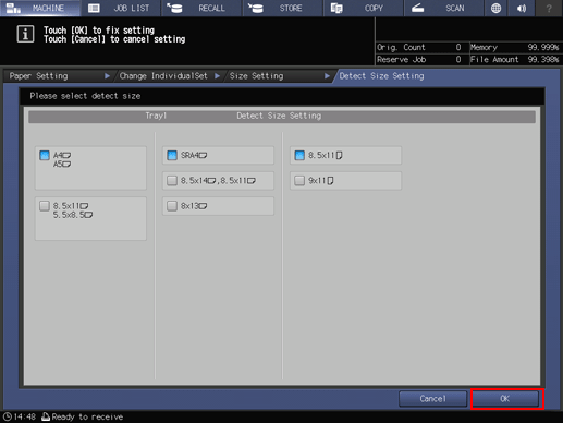 Press Detect Size Setting. The Detect Size Setting screen is displayed.