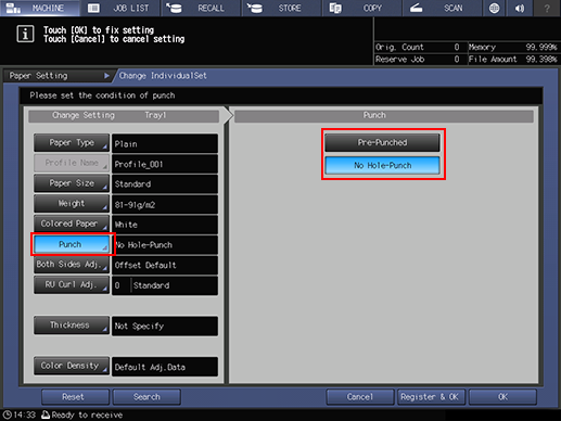 Select Pre-Punched when loading sheets with punched holes, and select No Hole-Punch when loading sheets without punched holes.