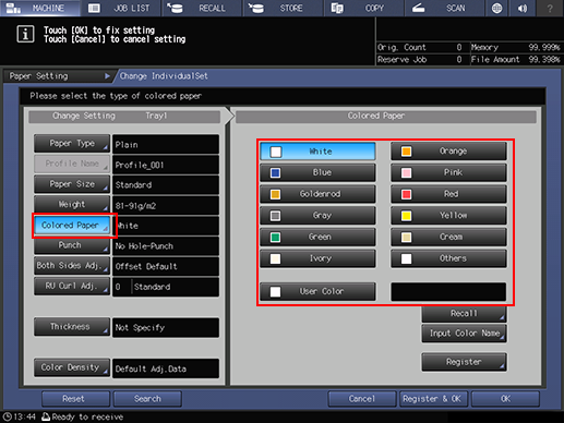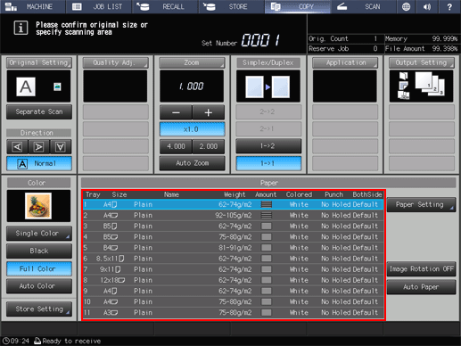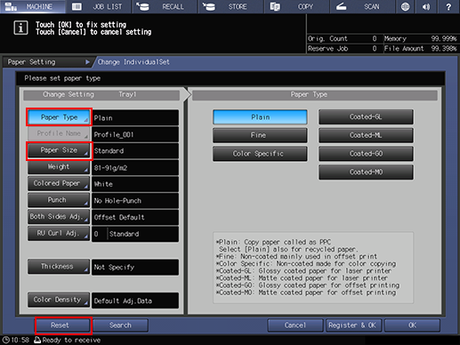 supplementary explanationThe screen provides Size, Name, Weight, Amount, Colored, Punch, and BothSide in the paper setting for each tray. The Name normally shows a paper type, or a profile name if registered specifications are recalled.