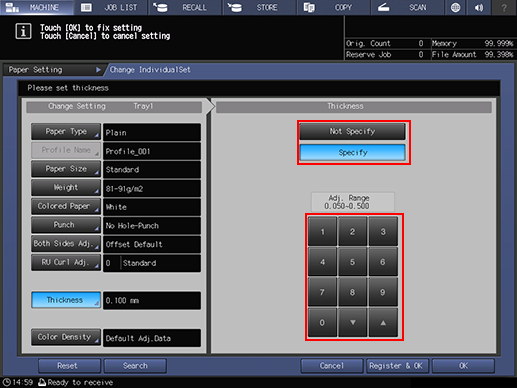 Selecting Specify displays the touch panel keypad. Use the touch panel keypad or down / up to enter the desired adjustment range. Available range is from 0.050 mm to 0.500 mm.