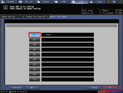 supplementary explanationTo change the specified color name, press Input Color Name to display the Input Colored Paper Name screen and rename it.