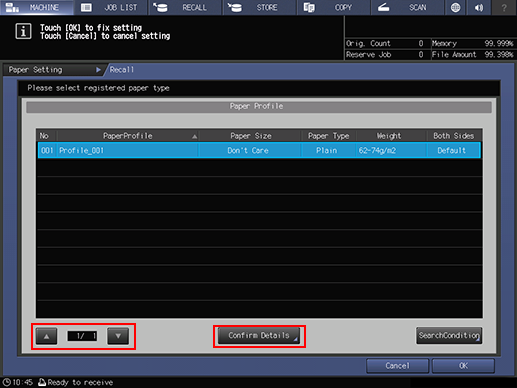 Press down or up on the Recall screen, select the desired paper profile from the list, and press Confirm Details.