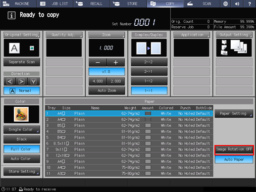 The machine is initially set to activate the Image Rotation function automatically. Follow the procedure below to deactivate/activate this function.