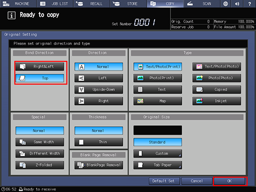 Select a Direction button provided under Original Setting according to the actual direction of the original.