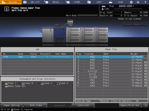 At this time, the message Please remove paper from main tray exit appears in the message area of the screen, and the Start LED turns orange. The machine cannot resume printing even if you press Start on the control panel.