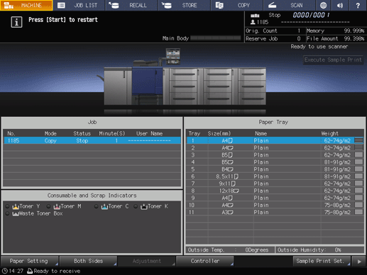 When the primary (main) tray goes up completely, the message Press [Start] to restart is displayed.