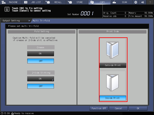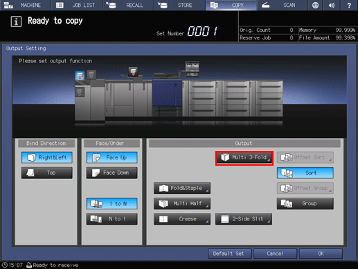 supplementary explanationWhen the saddle stitcher is equipped with Creaser Unit CR-101, Crease is available. For details, refer to Creasing Paper in Multi Tri-Fold.