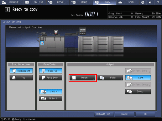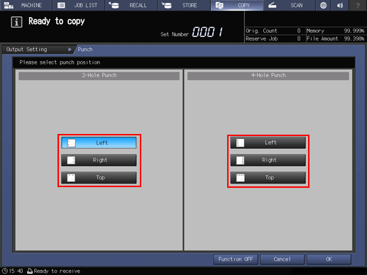 Punches file holes in output sheets. Follow the procedure below to select 2-, 3-, or 4-hole punch and punch position.