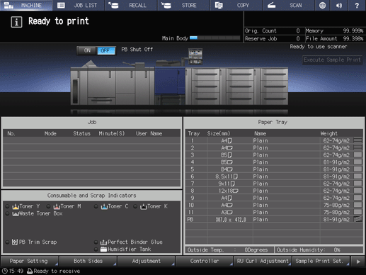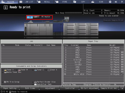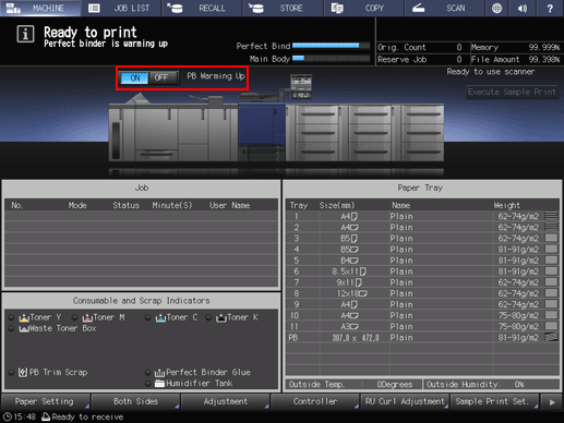 When you press ON of the perfect binder heater switch on the MACHINE screen, the perfect binder heater starts warm-up. Then, message PB Shut Off in the right of the perfect binder heater switch changes to message PB Warming Up.