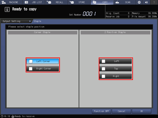 Copies are stapled in this mode. Select one of the following five types of the staple position.