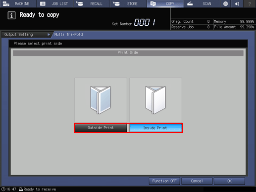 Finisher FS-532 mounted with Saddle Stitcher SD-510 allows the machine to copy on A4 short edge feed or 8.5 11 short edge feedpaper and tri-fold prints can be made. When selecting Tri-Fold, also select either inside or outside to have the printed image.