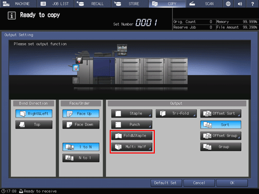 A machine mounted with Finisher FS-612, using Booklet under Application in combination, can fold paper in half or create a multiple page signature booklet folded in and stapled at two positions (saddle stitched) in the center.