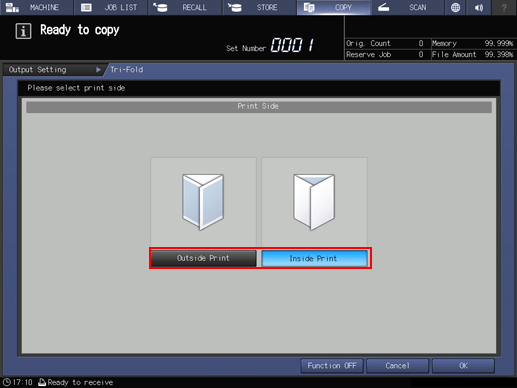 A machine mounted with Finisher FS-612 can copy on A4 short edge feed or 8.5 11 short edge feed paper, and then fold it inside in three. When selecting Tri-Fold, also select either inside or outside to have the printed image.