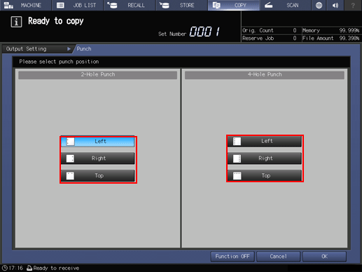Finisher FS-612 mounted with Punch Kit PK-512 or Punch Kit PK-513 can punch file holes in copies. Punch and Staple are compatible.