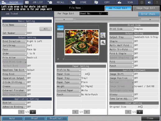 supplementary explanationPress Proof on the Job Ticket Edit screen to output a sample set. Pressing Proof (1st), if displayed, will output only the first sheet of the whole set.