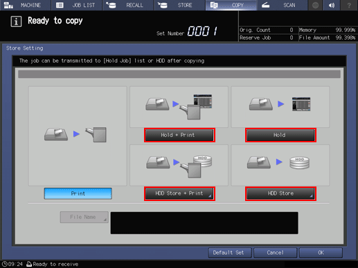 With Hold or HDD Store selected, a job is held or saved on the HDD without being copied.