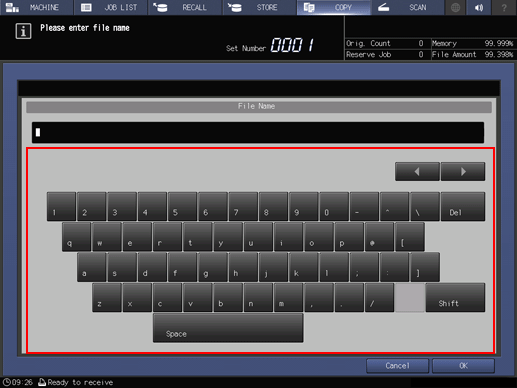 Press File Name on the Store Setting screen to display the File Name dialog box, enter the file name, then press OK.