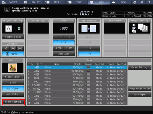 • supplementary explanationWith HDD Store or Hold selected, the message Press [Start] to scan originals is displayed in the message area of the COPY screen.
