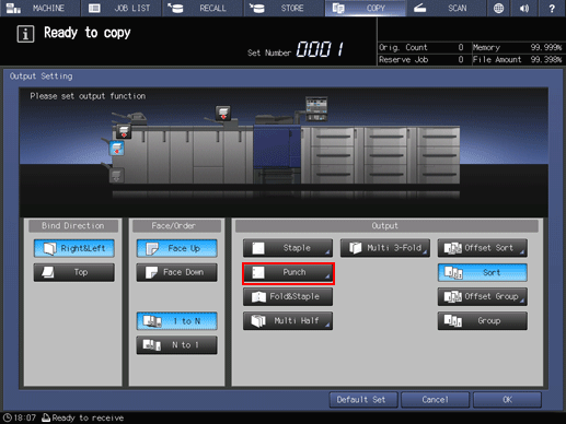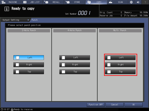 Set the Punch mode to punch file holes in printed sheets. Follow the procedure below to select the paper size (A4 long edge feed, 8.5 11 long edge feed) and punch position. To select the punch hole type, change the die set to the desired one.