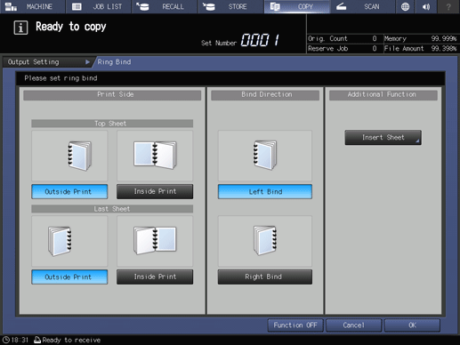 • supplementary explanationWhen binding a simplex-printed set, select Outside Print or Inside Print for each of the top sheet and the last sheet.