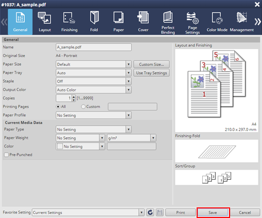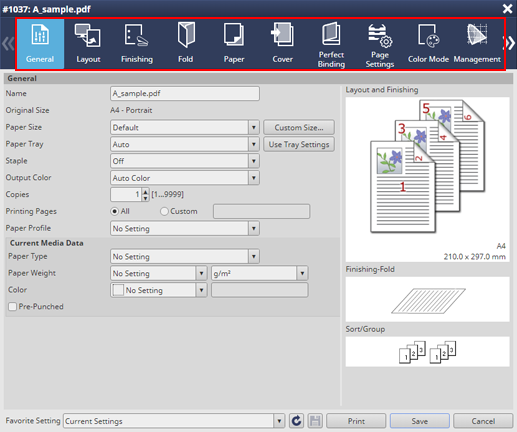 The Job Edit (print setting) screen of AccurioPro Print Manager allows you to make the following settings.