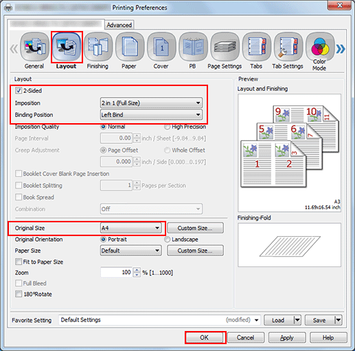 The example below creates a print setting that the original PDF file of 32 A4 pages is reduced and printed 2 in 1 on both sides of A4 paper.