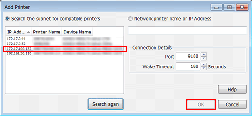 supplementary explanationIf no printer is displayed, specify Port and Wake Timeout in Connection Details, then click Search again