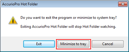Minimize to tray: The AccurioPro Hot Folder screen closes. This is resident on the task tray to monitor the hot folder.