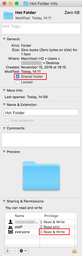 Select the Shared folder check box, and set everyone to Read & Write in Sharing & Permissions:.