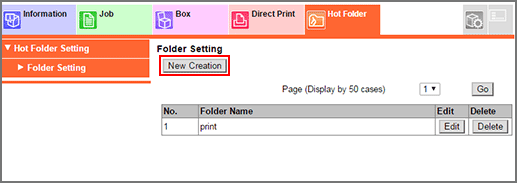 Create a hot folder of this machine. When setting access authentication, associate a hot folder with a user who sets access authentication. To create a hot folder, access the user mode of PageScope Web Connection.