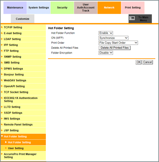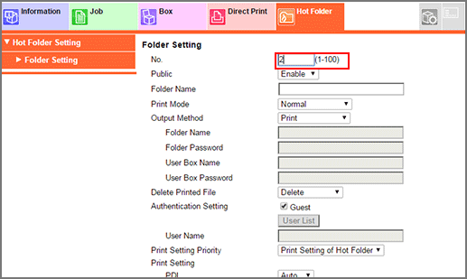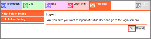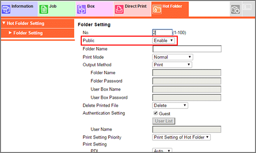 To use the Hot Folder function, set Enhanced Security Mode to OFF. For details on the Enhanced Security Mode, refer to Enhanced Security Mode.