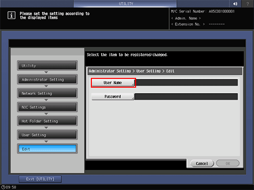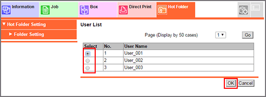 The user setting (user name and password) of the Hot Folder can also be registered by using PageScope Web Connection. For details about PageScope Web Connection, refer to About User Setting.