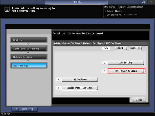 From the UTILITY screen, go to Administrator Setting - Network Setting - NIC Settings - Hot Folder Setting and check the setting.