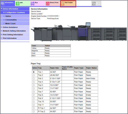 supplementary explanationTo check the print job copied in Hot Folder or the sending condition of print job, press Hot Folder on the JOB LIST screen. For details, refer to Spool Screen.
