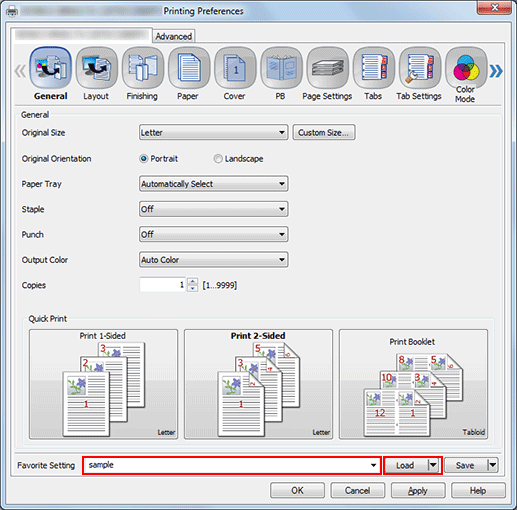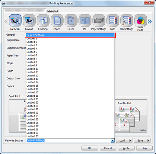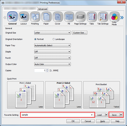 When the print setting is completed, select any user setting number from the Favorite Setting pull-down menu.