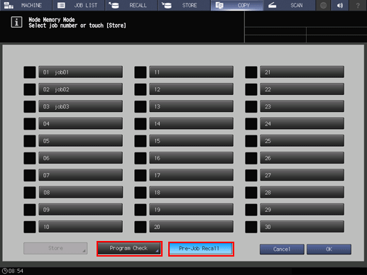• preconditionWhen recalling the previous job settings, display the COPY screen, then press Mode Memory on the control panel. This function is unavailable from the MACHINE screen.