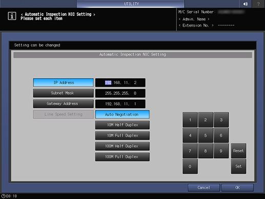 Selecting Automatic Inspection NIC Setting allows you to check the automatic inspection report from Web Utilities of the Auto Inspection Unit UK-301. This value is set by default at the time of installation.