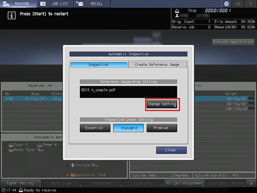 The print job starts, and Auto Inspection is performed. If an error is detected by the automatic inspection, it is displayed in IQ Detected Result. The Auto Inspection report can be viewed on this machine or by using Web Utilities of the Auto Inspection Unit UK-301.