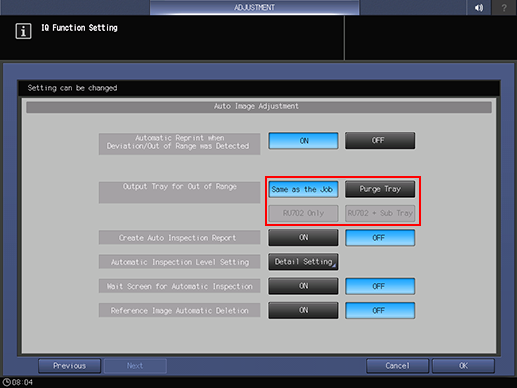 To avoid page duplication, a printout, in which an error is detected by automatic inspection, is output to the same tray as normal printouts, not the Purge Tray. Reprinting is not performed. This setting is available if you want to reduce paper loss or use paper remaining in the machine at the same time.