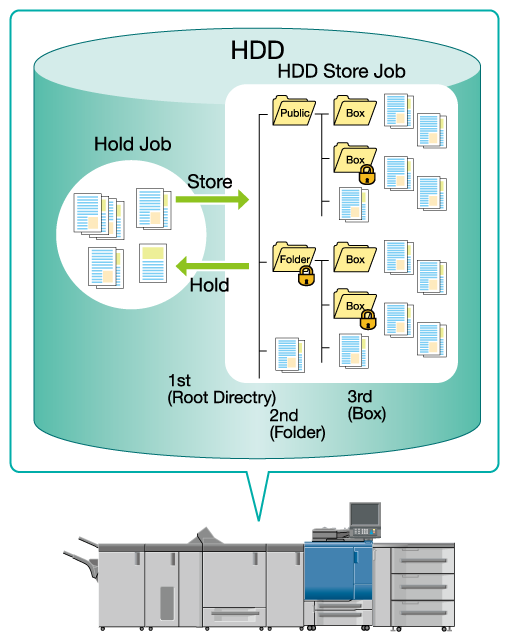 Further, you can manage a job saved on the HDD using a folder or user box.