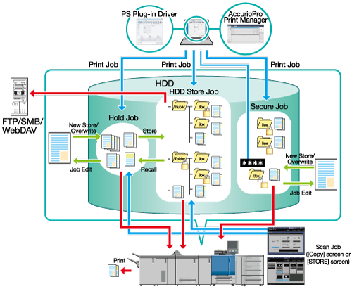 You can save a job data scanned using this machine (a job scanned on the COPY screen and STORE screen) and a print job from a computer as a hold job or HDD saved job.