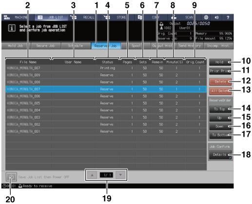 From the list displaying the reserved jobs, you can operate Prior Print, change the order of reservations, and check the status of the jobs.